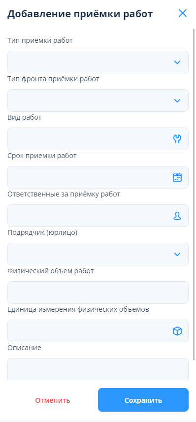 В окне добавления приемки работ необходимо заполнить следующие поля: