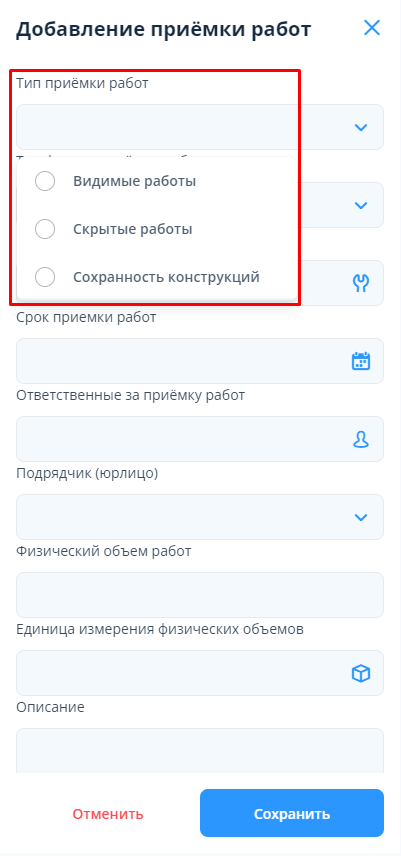 “Тип приёмки работ” - выбрать один из типов принимаемых работ: видимые работы, скрытые работы, сохранность конструкций.