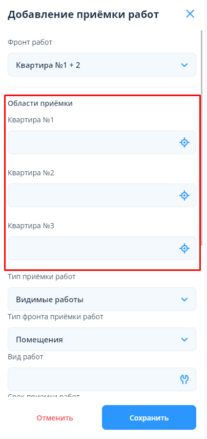 После выбора помещений необходимо нажать на кнопку “Применить”. После нажатия кнопки “Применить” система автоматически добавляет по каждому выбранному пользователем помещению отдельное поле “Области приёмки”.