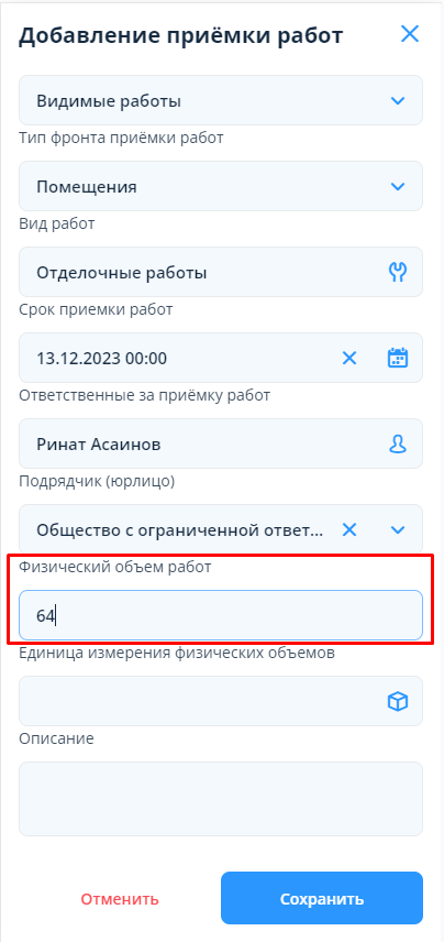 В появившемся окне зафиксировать результаты приёмки работ можно двумя способами: в процентном соотношении в поле “Объём принятых работ (%)” и в физическом объёме в поле “Физический объём работ”.