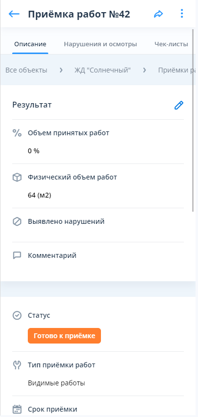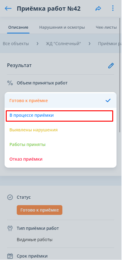 По умолчанию в карточке приёмки работ установлен статус “Готово к приёмке“. После выхода на объект на приемку работ проверяющему необходимо изменить статус на “В процессе приёмки“.