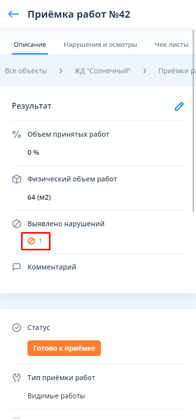 После добавления нарушения появится счетчик нарушений на вкладке чек-листа, а также в карточке результатов приемки работ.
