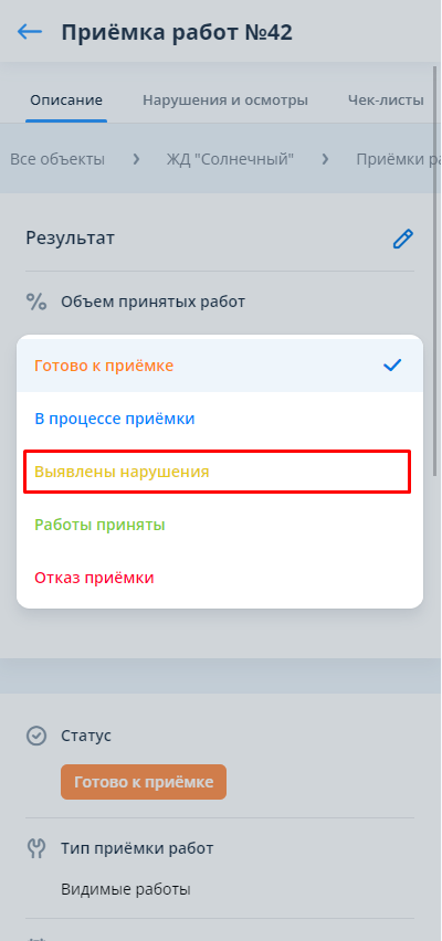 После сохранения всех выявленных нарушений необходимо сменить статус приёмки работ на “Выявлены нарушения” на вкладке “Описание”.