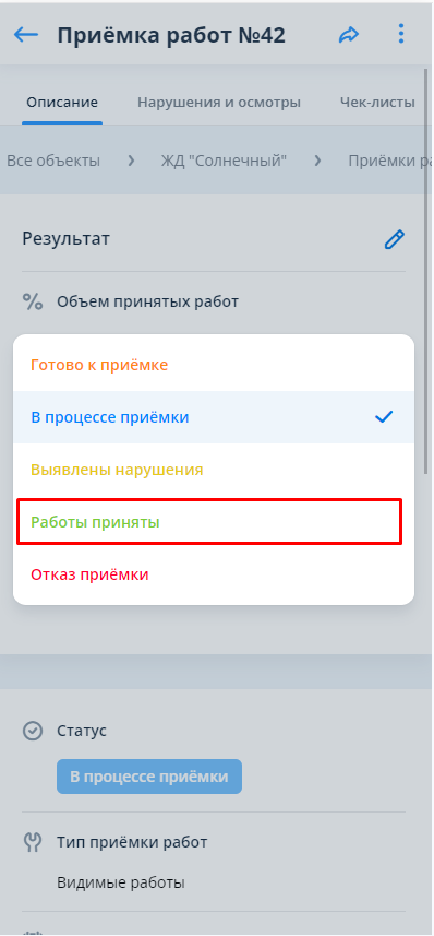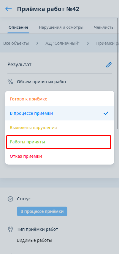Если нарушения не были выявлены и все категории чек-листа приняты, то на вкладке “Описание” необходимо сменить статус приемки работ на “Работы приняты”.