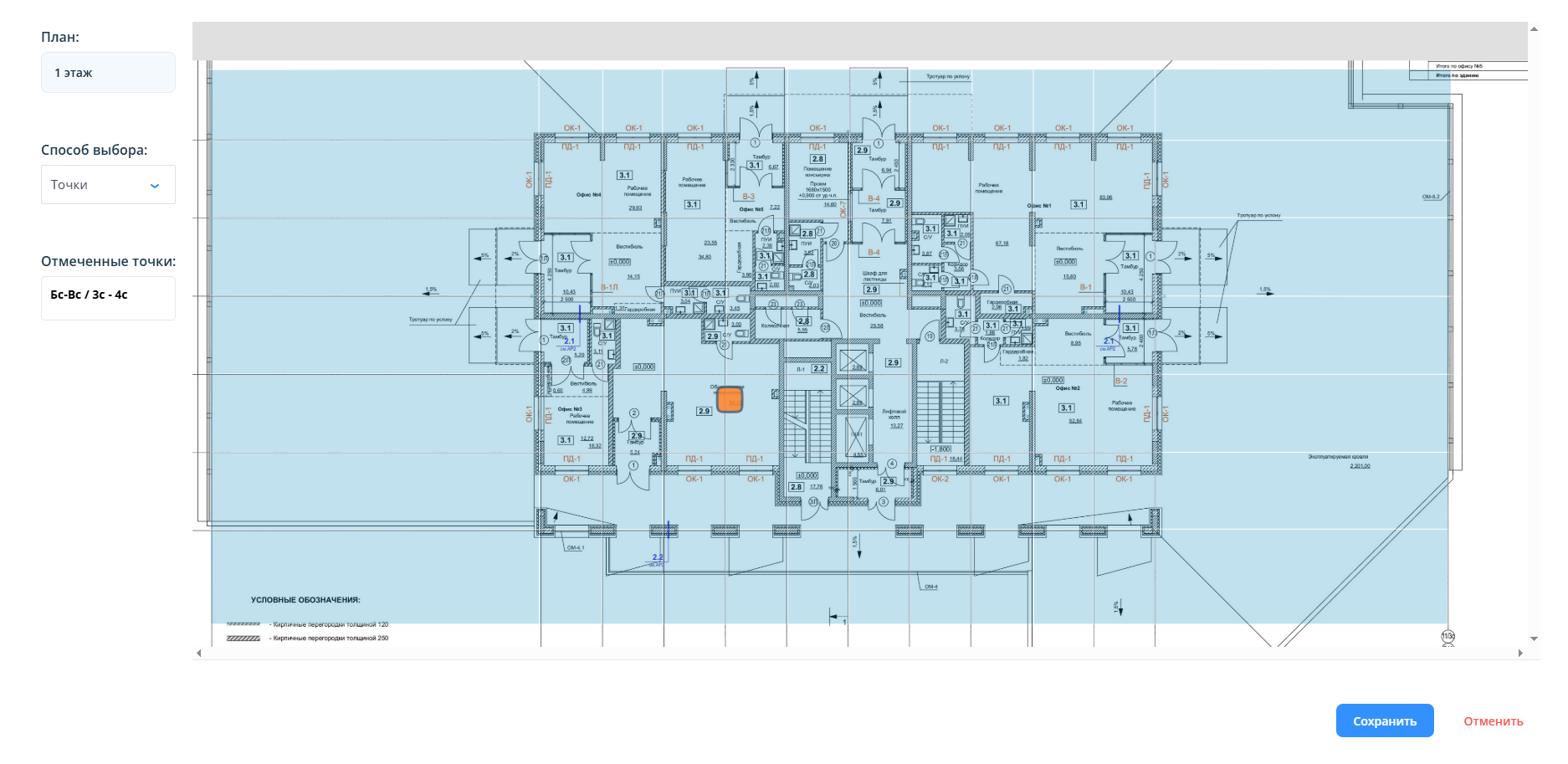 После этого откроется план, на котором необходимо указать точку или сектор, таким образом обозначив область приемки.