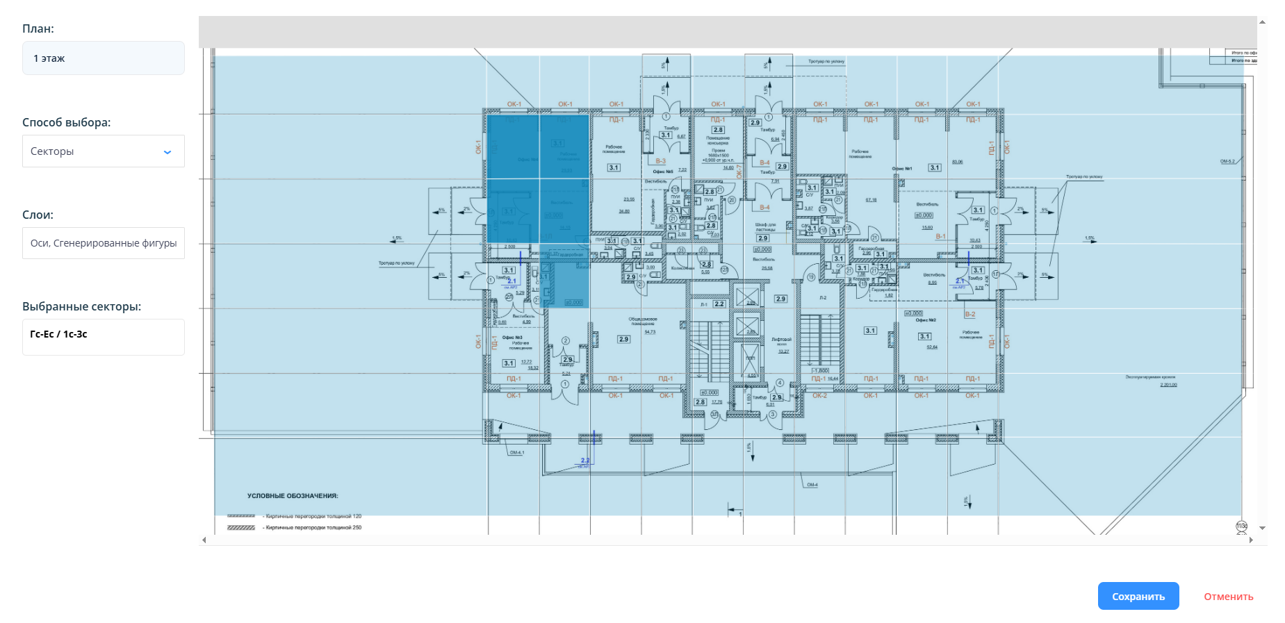 Далее - нажать на кнопку “Сохранить”, после чего в окне добавления приемки работ в поле с областью приемки подтянутся строительные оси.