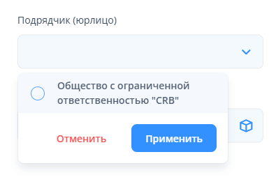 "Подрядчик (юрлицо)" -  выбрать юрлицо компании-Подрядчика, ответственного за приёмку работ.