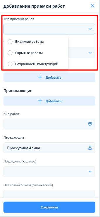“Тип приемки работ” - выбрать один из типов принимаемых работ: видимые работы, скрытые работы, сохранность конструкций.