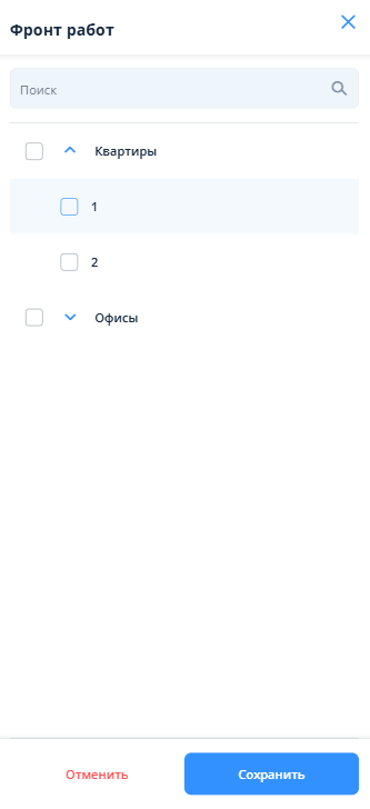 После выбора типа фронта приемки работ появится поле "Фронт работ", которое предназначено для выбора структур/помещений, по которым сдаются работы (это могут быть этажи, системы и пр. либо разные типы помещений, которые имеются на объекте - “Апартаменты”, “Кладовые”, “МОП” и пр.).