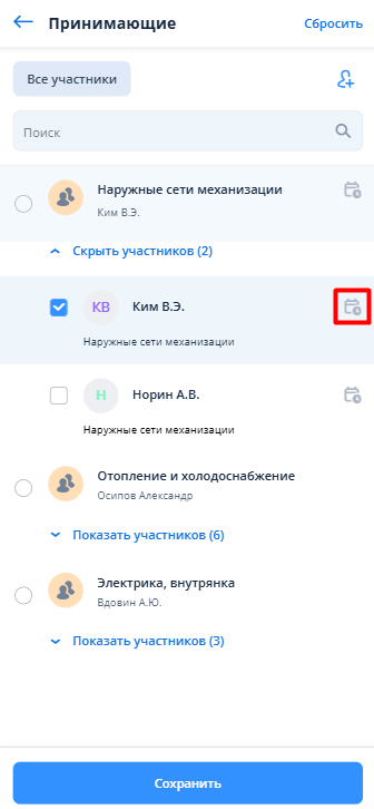 После нажатия на кнопку "Сохранить" окно закроется и в блоке принимающих отобразятся выбранные принимающие или рабочая группа.