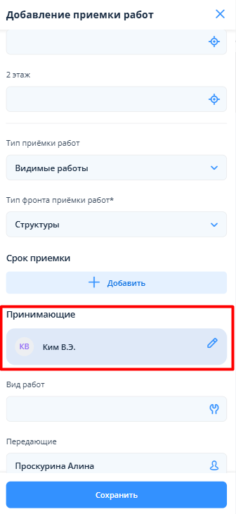 ”Передающие” - автоматически устанавливается пользователь, создающий приемку работ. Также можно выбрать сотрудника компании, ответственного за передачу заявленных работ, из предложенного списка.