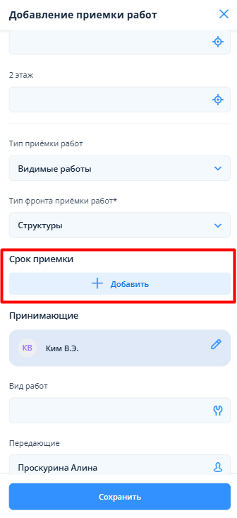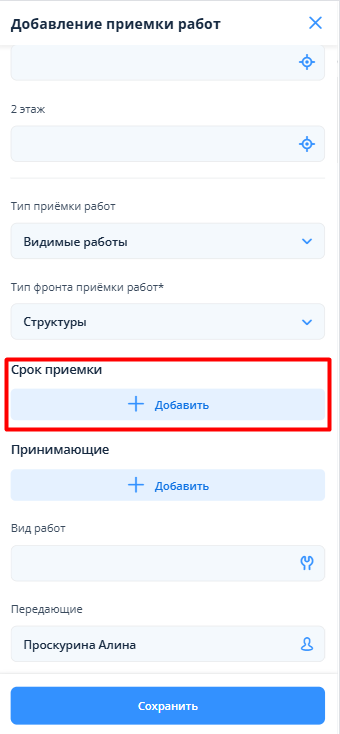 Для заполнения поля "Срок приемки" необходимо в одноименном блоке нажать на кнопку "+ Добавить".