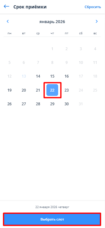 Если следующим шагом выбран(-ы) принимающий(-ие) с расписанием, под блоком календаря нужно нажать на кнопку "Выбрать слот" и выбрать нужный слот для приемки.