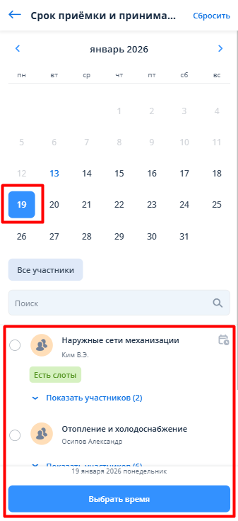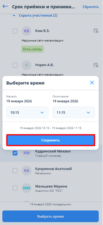 После выбора принимающего(-их) под блоком календаря необходимо нажать на кнопку "Выбрать время" и определить время начала и время окончания приемки.