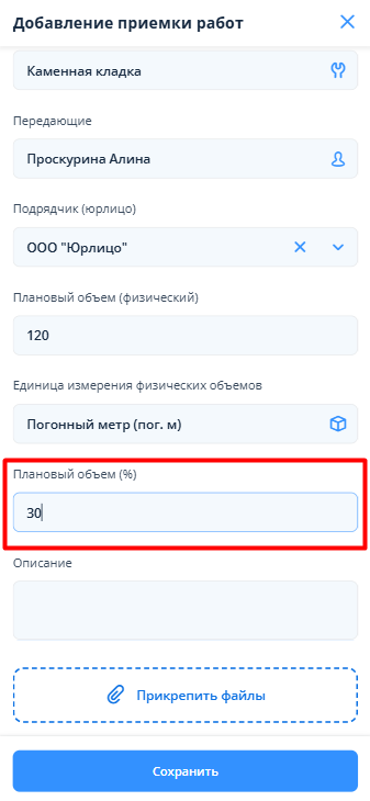 ”Плановый объем (%)” - поле для заполнения объема сдаваемого вида работ в процентном соотношении от общего объема указанного вида работ.