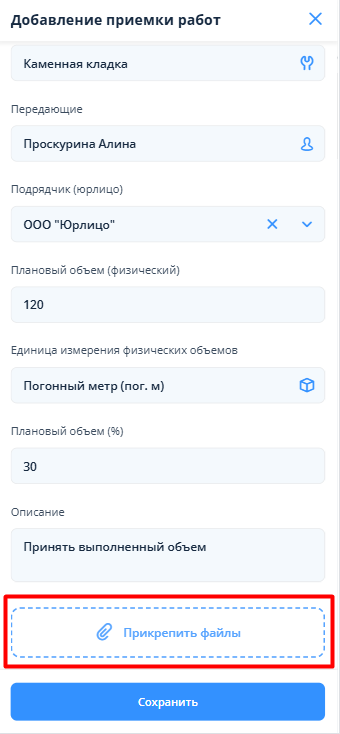”Прикрепить файлы” - кнопка для прикрепления файлов, относящихся к создаваемой приемке.