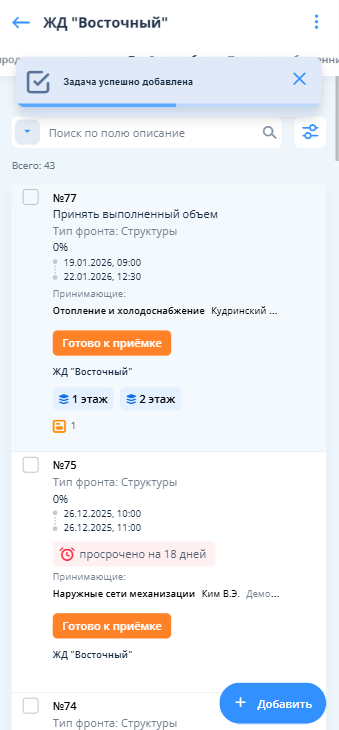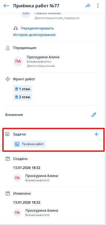 После создания новая приёмка отобразится в реестре приёмок. Также автоматически будет создана связанная задача с типом “Вызов на приемку работ”.