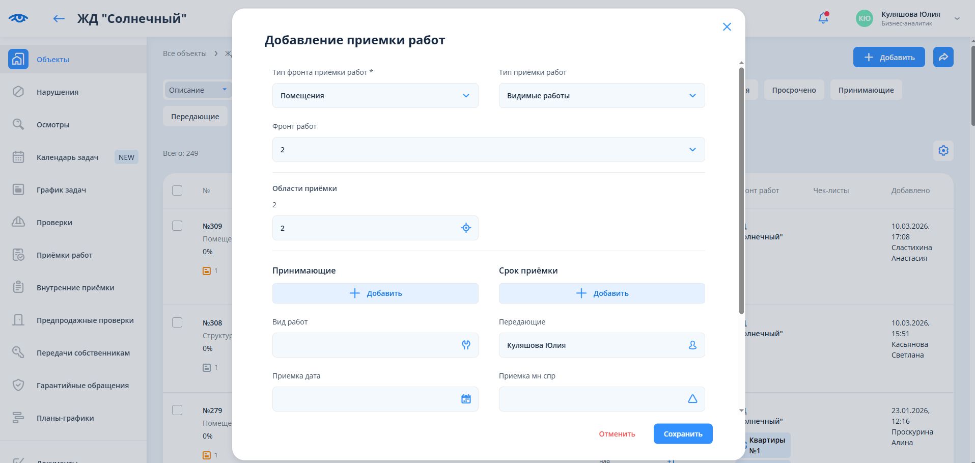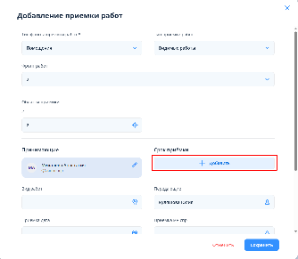 После сохранения данных в поле "Срок приемки" и/или в карточке приемки работ время начала приемки - время начала первого выбранного слота, время окончания приемки - время окончания последнего выбранного слота.