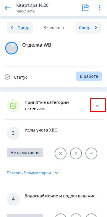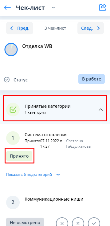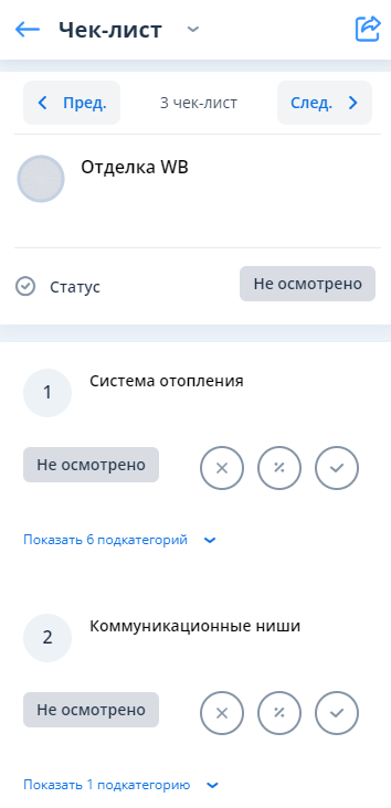 По умолчанию у подкатегории чек-листа установлен статус “Не осмотрено”. При смене статуса у первой подкатегории в целом присваивается тот же самый статус (за исключением ситуации, когда устанавливается статус “Принято” - в таком случае произойдет автоматическая смена статуса на “Принято частично”).