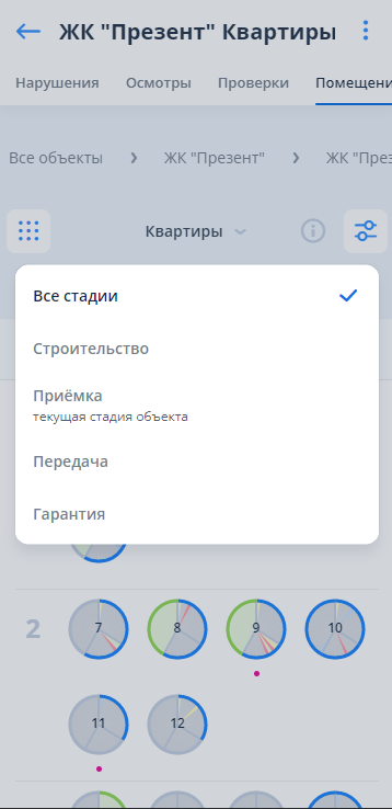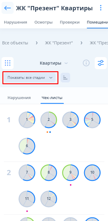 Для того, чтобы при проваливании в помещение отобразились чек-листы нужной стадии, необходимо выбрать стадию шахматки помещений.