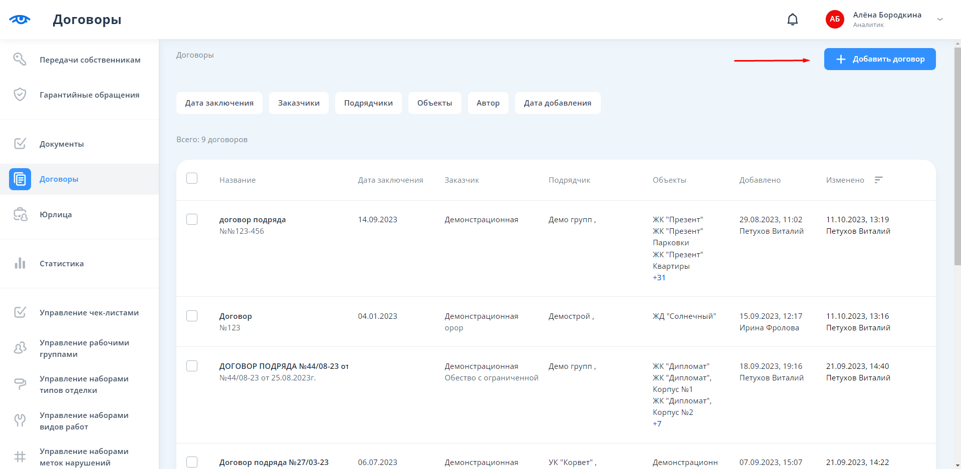 Находясь в разделе «Договоры», необходимо в правом верхнем углу нажать на кнопку “+Добавить договор”.