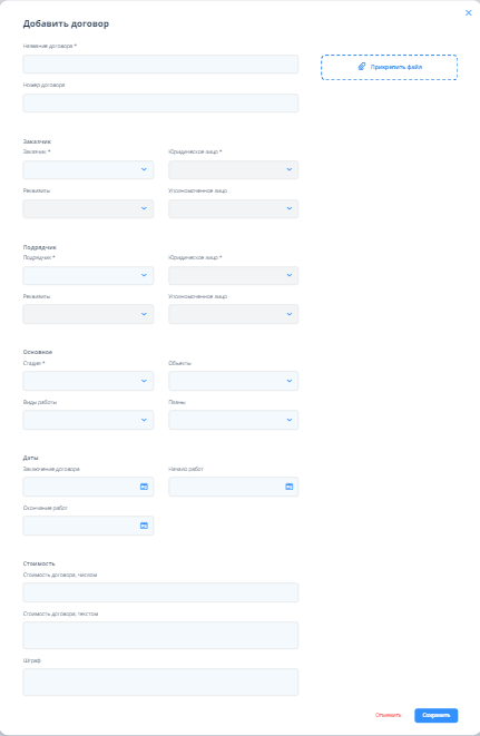 В открывшейся карточке добавления нового договора необходимо заполнить данные договора.