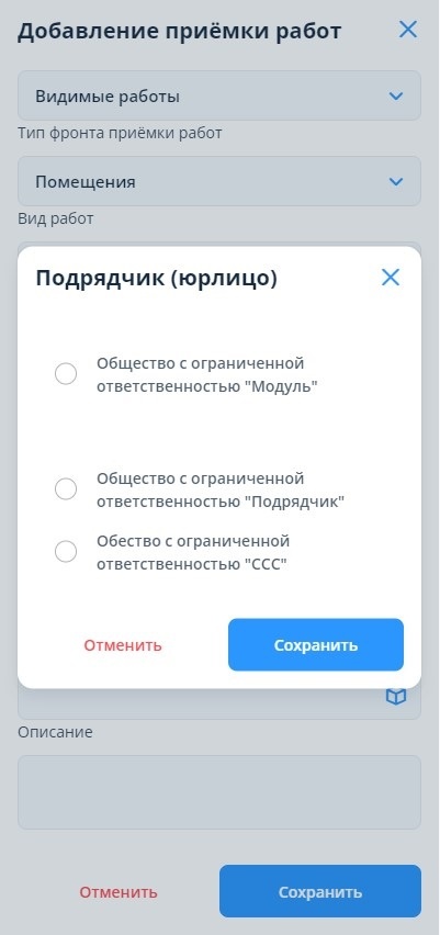“Подрядчик (юрлицо)” - окно для выбора компании-Подрядчика, ответственного за приёмку работ.