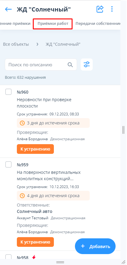 Для приёмки работ без чек-листа для добавления выявленных нарушений или осмотров используется вкладка “Нарушения и осмотры”.