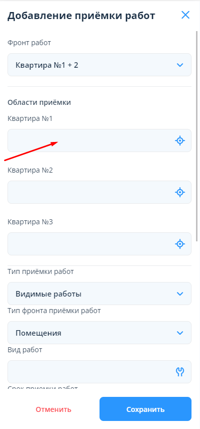 Поле “Области приёмки” предназначено для обозначения областей приёмки на плане. К области приемки по каждому из выбранных пользователем помещений автоматически подтягивается план, привязанный к данному помещению. Для выбора области приёмки необходимо нажать на поле с названием из фронта работ (например, “Квартира №1” на скрине). После этого откроется план, на котором необходимо указать точку, таким образом обозначив область приемки, и нажать на кнопку “Сохранить”.