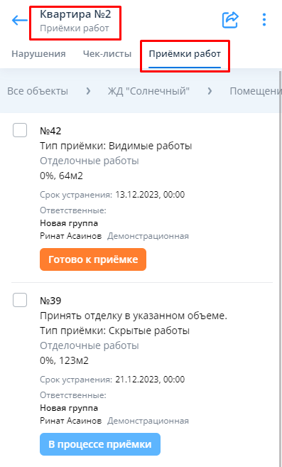 После нажатия на помещение пользователь переходит в карточку соответствующего помещения на вкладку “Приёмки работ”.