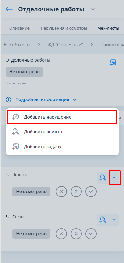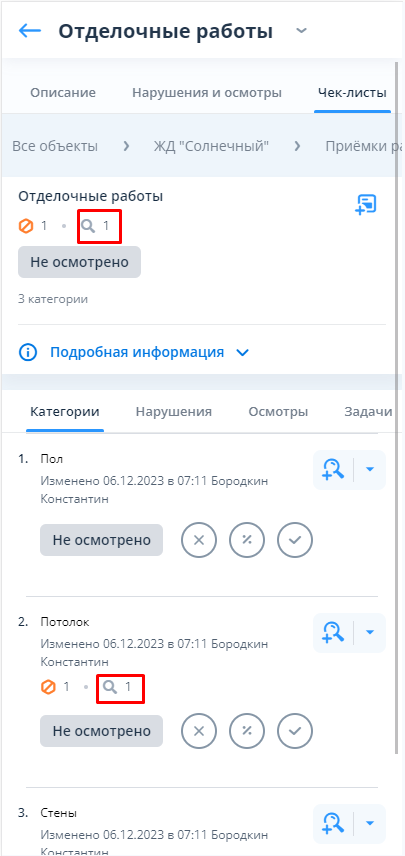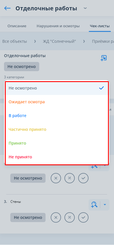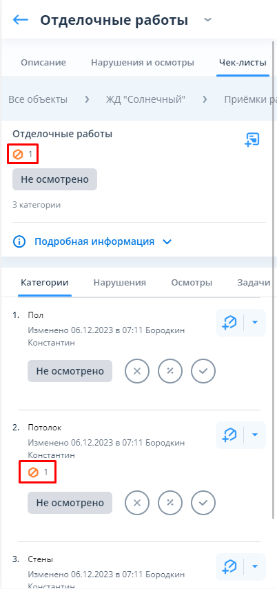 Во время приёмки проверяющий в блоке чек-листов меняет статусы категорий/подкатегорий, а также регистрирует выявленные нарушения либо фиксирует проведённые осмотры выполненных работ.