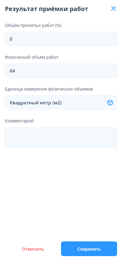 В появившемся окне зафиксировать результаты приёмки работ можно двумя способами: в процентном соотношении в поле “Объём принятых работ (%)” и в физическом объёме в поле “Физический объём работ”.