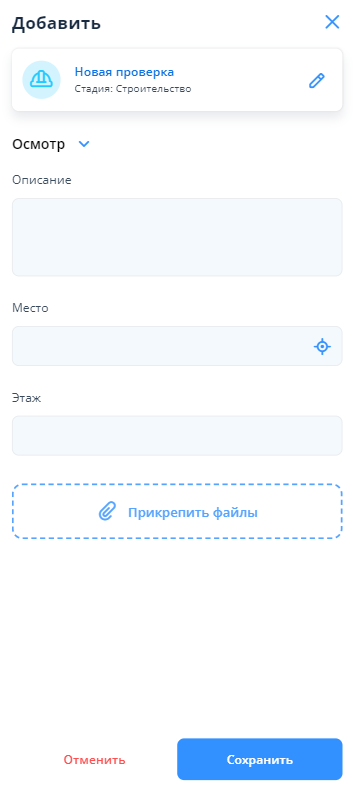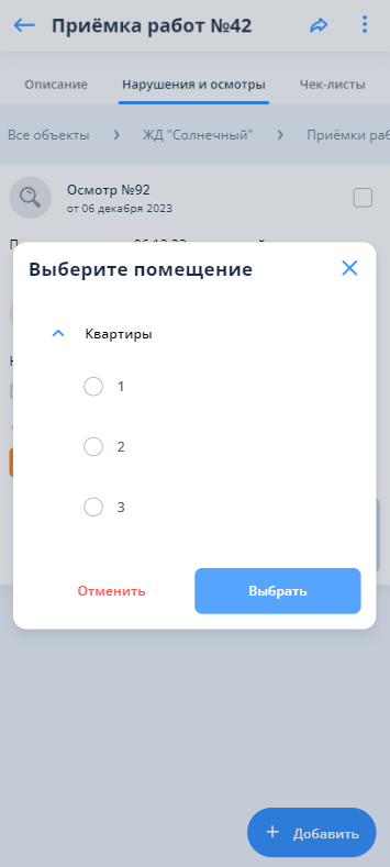 Для добавления осмотра также необходимо нажать на кнопку “+ Добавить” в правом нижнем углу, затем выбрать помещение, в котором необходимо зафиксировать осмотр.