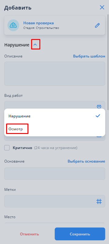 После этого в окне создания нарушения сменить на “Осмотр” - нажать на кнопку стрелочки и в появившемся окне выбрать “Осмотр”. После этого появится стандартное окно для добавления осмотра. Необходимо заполнить поля и сохранить осмотр.