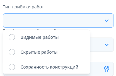 “Тип приёмки работ” - выбрать один из типов принимаемых работ: видимые работы, скрытые работы, сохранность конструкций.