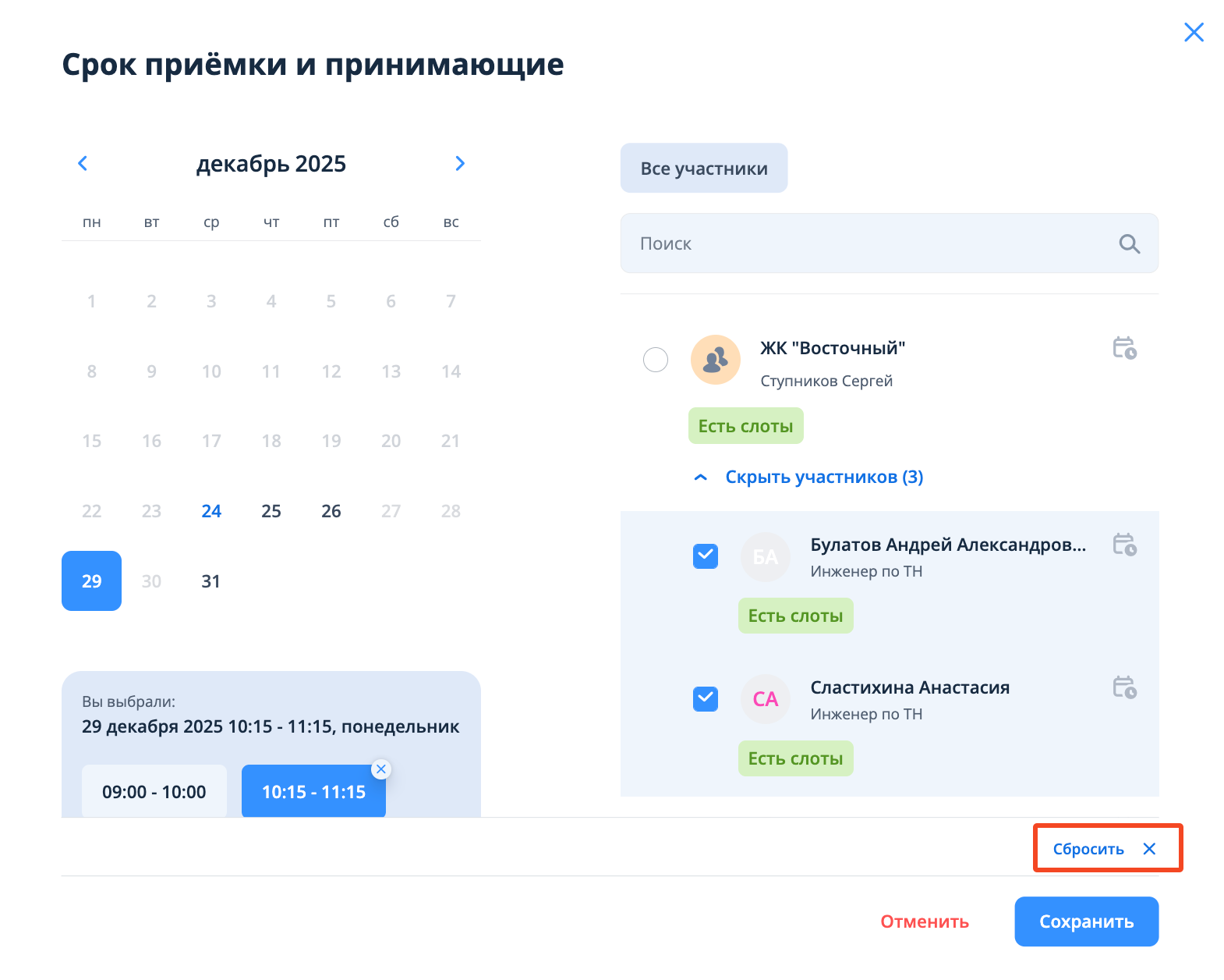 Если выбраны принимающие и/или срок приемки и нужно сбросить все значения, то необходимо нажать на кнопку "Сбросить". Данные сбрасываются и окно возвращается к исходному состоянию - календарю для выбора дат.