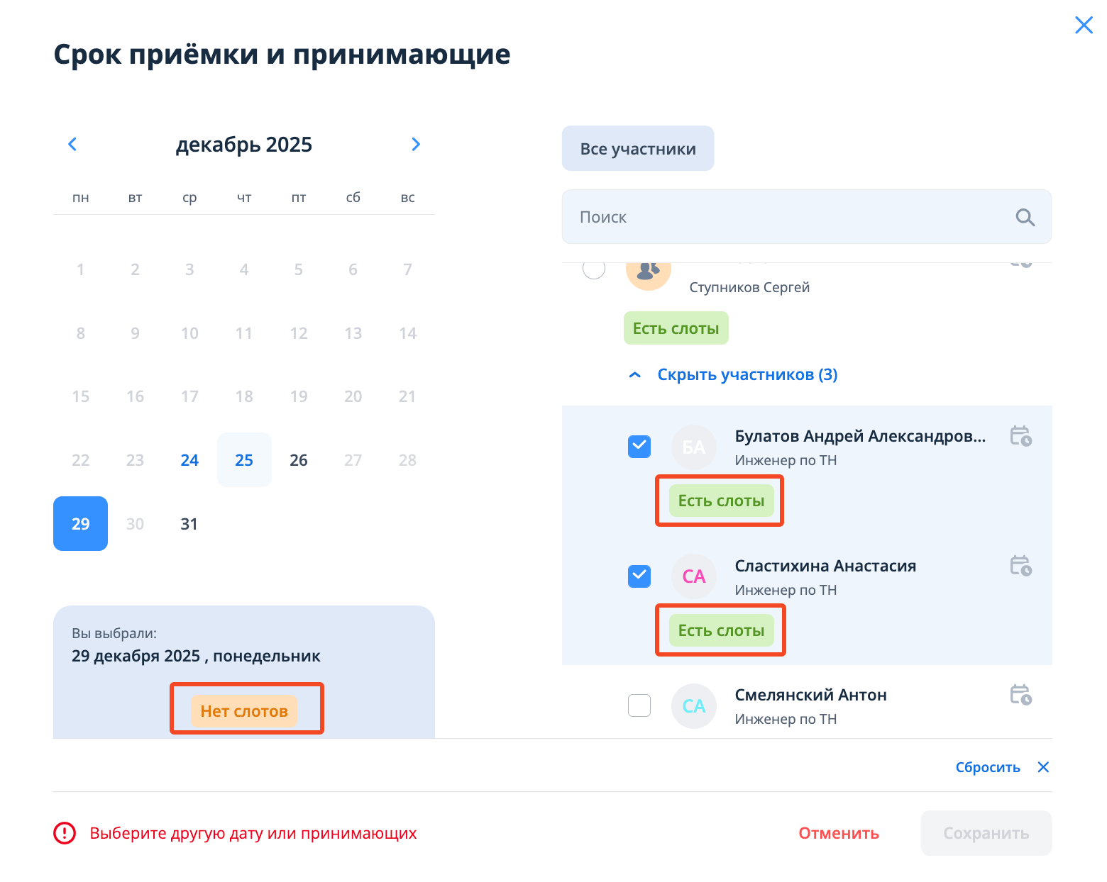 В случае, если одного из выбранных принимающих отсутствует свободный слот в отмеченный день, система отобразит уведомление "Выберите другую дату и принимающих". Кнопка сохранения видоизменится на неактивную "Нет слотов".