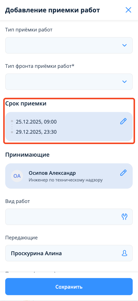После сохранения окно закроется, и в полях "Срок приемки" и "Принимающие" сохранятся выбранные значения.