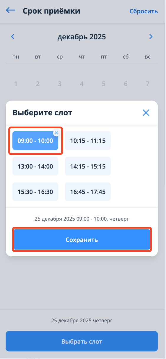 После выбора конкретного слота необходимо нажать на кнопку "Сохранить". Далее окно закроется и в блоке срока приемки сохранятся внесенные значения.