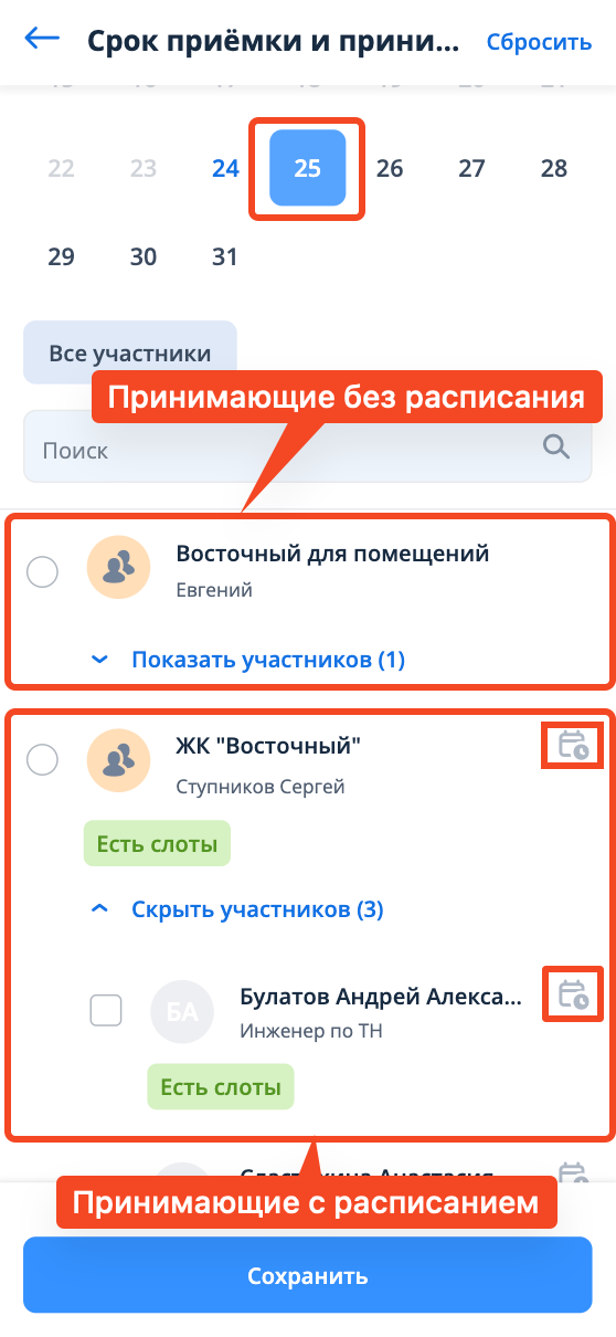 У сотрудников с настроенным расписанием выбор срока приемки происходит в рамках свободных временных слотов. В окне выбора принимающего справа от такого сотрудника(-ов) будет отображаться иконка календаря.
