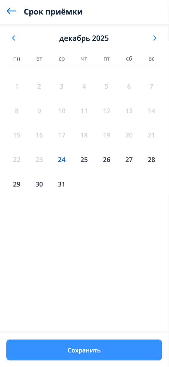 В календаре доступен выбор срока приемки в пределах одного календарного дня. Все даты в календаре, кроме прошедших, кликабельны. Дни с наличием свободных слотов подсвечены черным цветом, дни с отсутствием свободных слотов отображаются серым.
