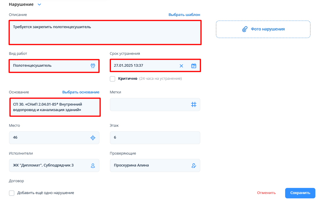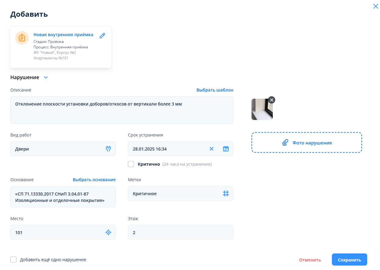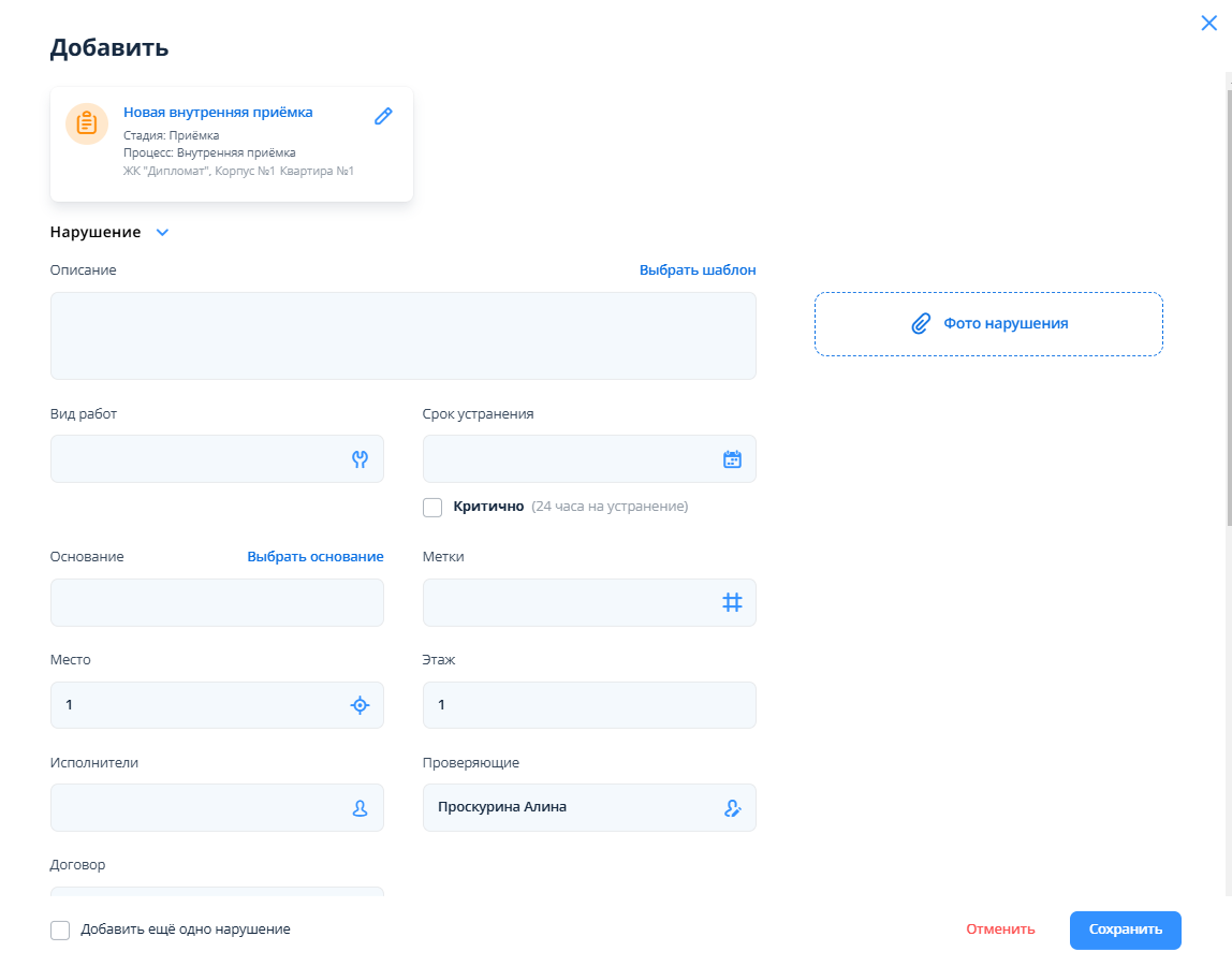 Окно создания нарушения в рамках внутренней приемки с заполненными полями: