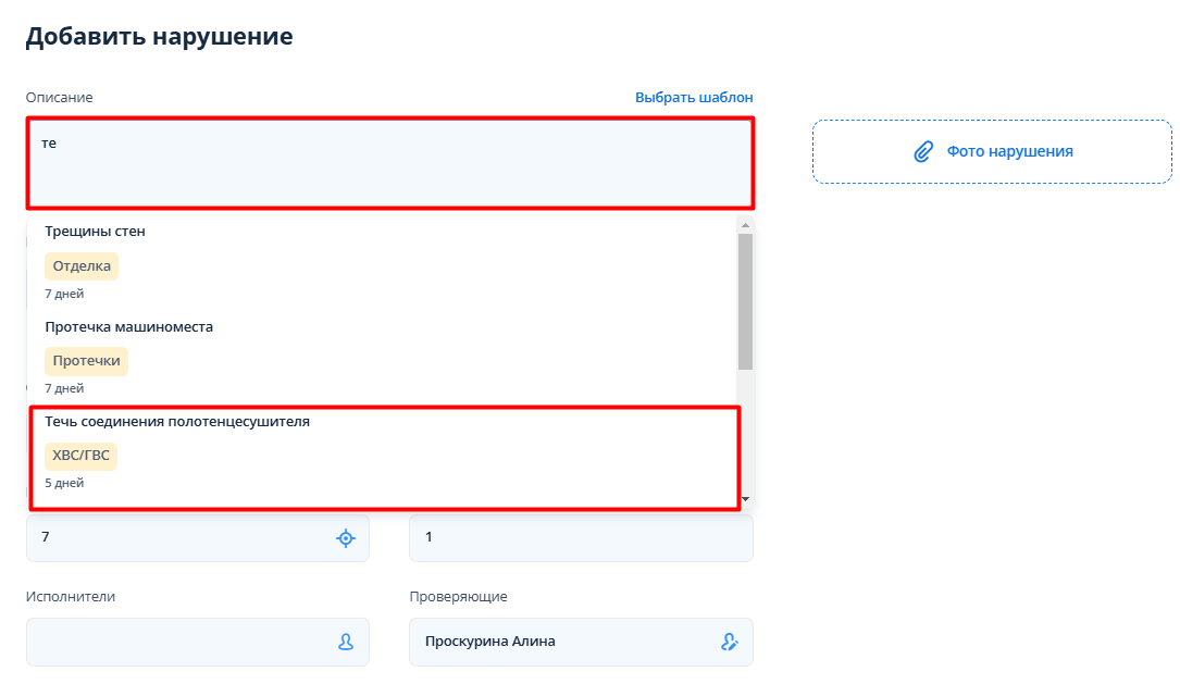 Если у объекта настроены шаблоны нарушений, то при вводе значений в поле “Описание”, а также при нажатии на кнопку “Выбрать шаблон” появляется выпадающий список шаблонов с указанием вида работ и описания нарушения. Можно выбрать нужный, после чего поля нарушения заполнятся автоматически (вид работ, срок устранения, основание).