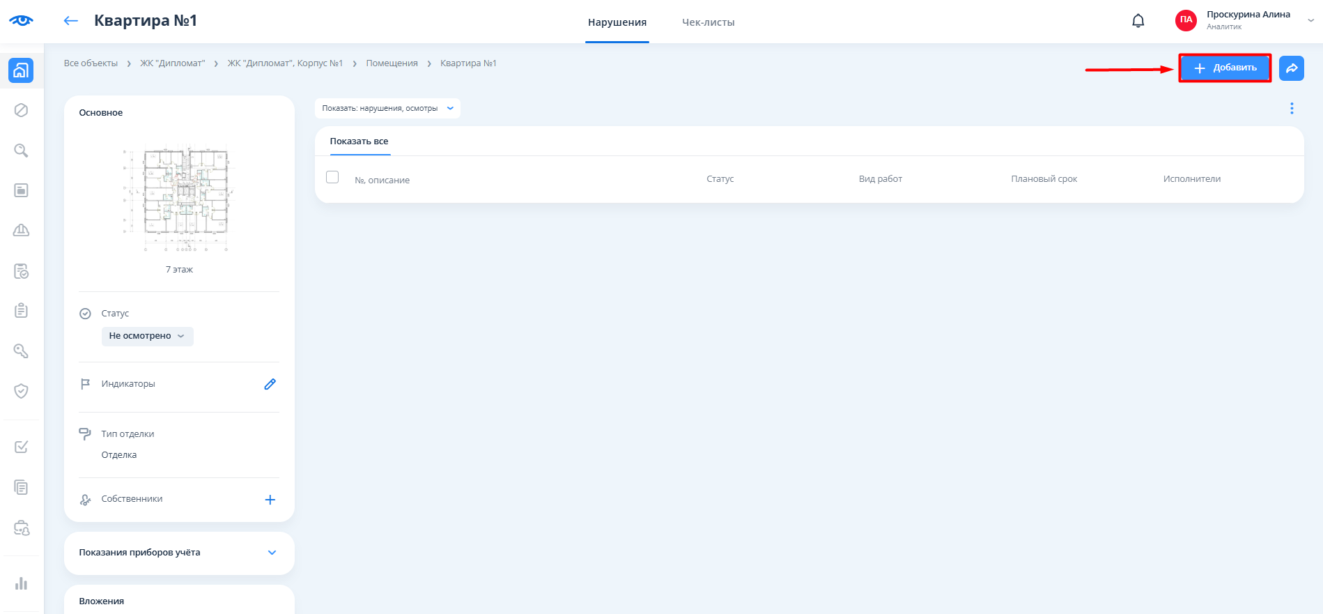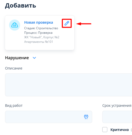 Для добавления нарушения в процессе внутренней приёмки в правом верхнем углу экрана нужно нажать на кнопку "+ Добавить".