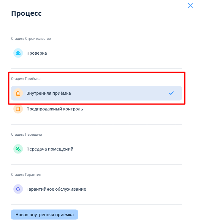 Если процесс иной, необходимо сменить его, нажав на иконку карандаша. В открывшемся окне выбора сменить процесс на “Внутренняя приемка”.