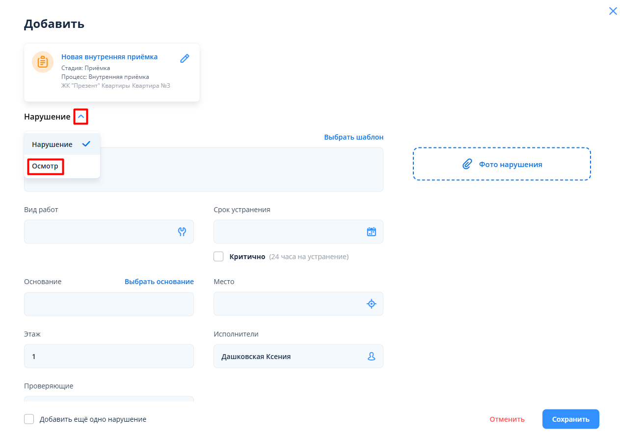В рамках внутренней приемки можно регистрировать также осмотры (для тех случаев, когда нарушений не выявлено, но нужен отчет о том, что осмотр действительно был). Для создания осмотра в окне создания нарушения необходимо нажать на иконку галочки и переключить на “Осмотр”.