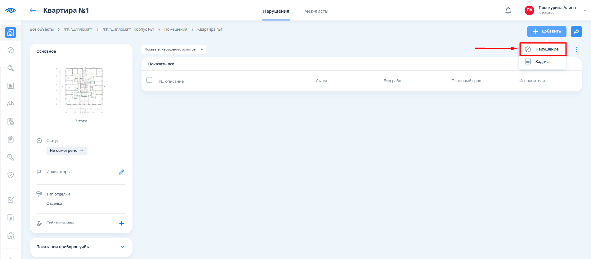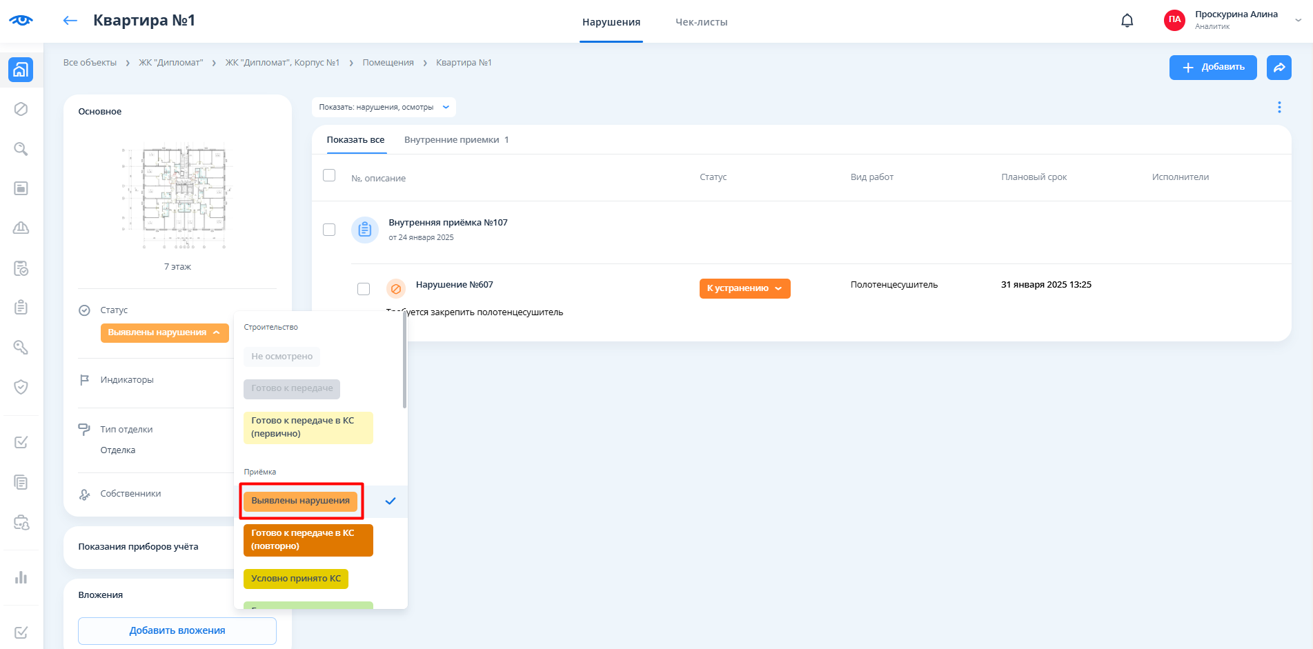 После сохранения нарушения необходимо сменить статус помещения на "Выявлены нарушения".
