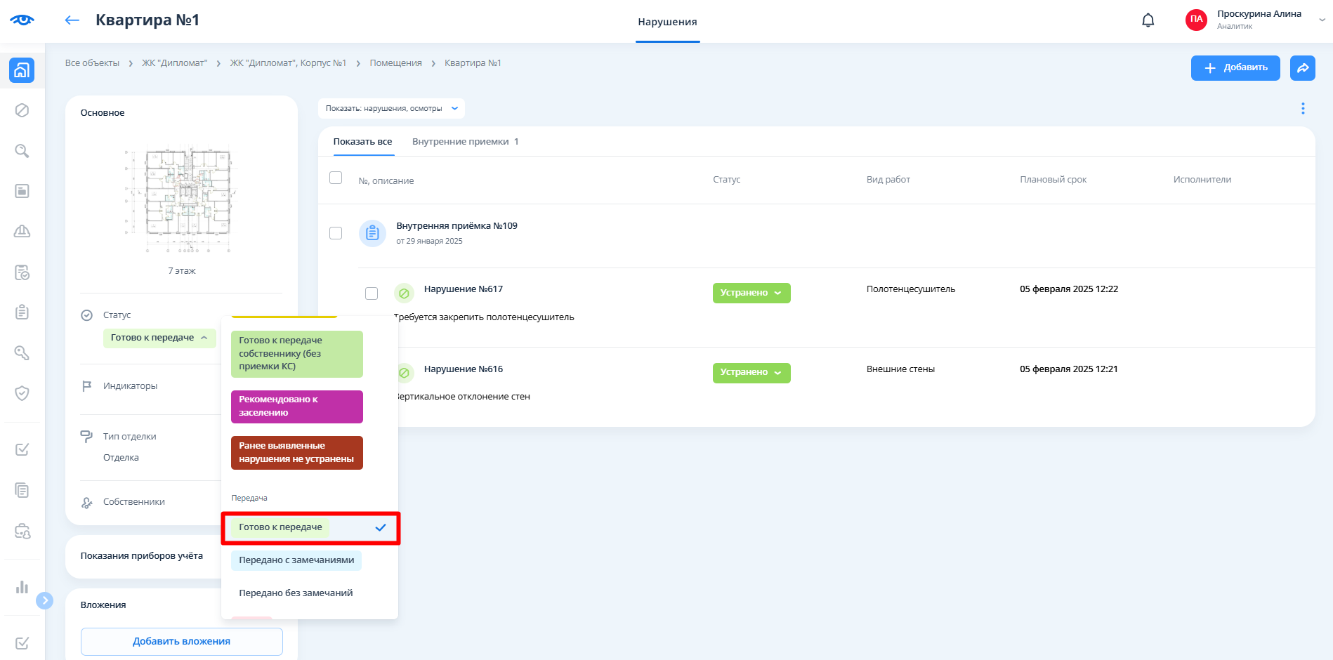 Как только работа с нарушением в помещении закончена и оно переведено в статус “Устранено”, в карточке помещения необходимо сменить статус на “Готово к передаче”, поскольку данное помещение готово к следующему этапу - передаче собственнику.