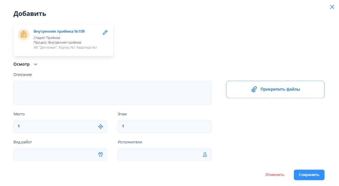 Добавление осмотра в процессе “Внутренняя приемка”