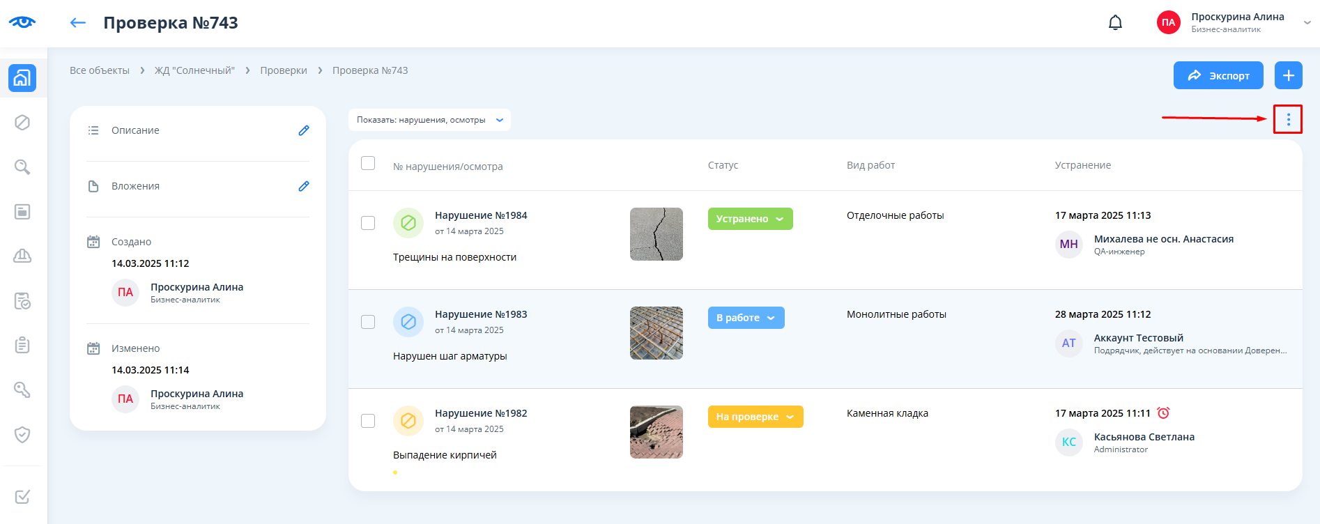 В верхней части страницы по части навигационной цепочки видно, что теперь проверка вместе с нарушениями находится в целевом объекте.
